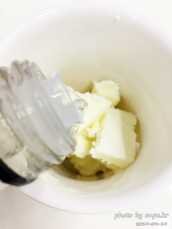 컵에 버터를 적당히 넣어줍니다. 버터는 커클랜드 가염버터(KIRKLAND SIGNATURE)를 사용했어요.