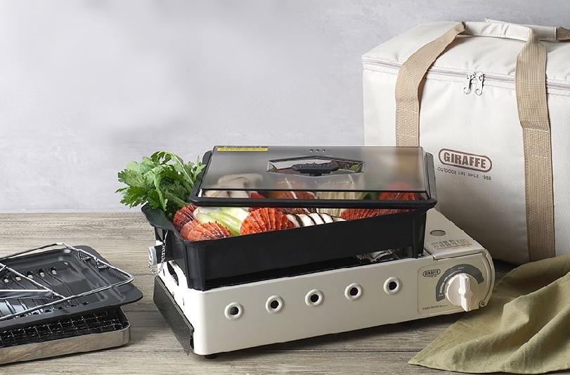 지라프 구이 바다 아이보리 에디션 M 풀세트 (가방 포함) / 가스그릴 버너 전골팬. 가격은 128,700원.