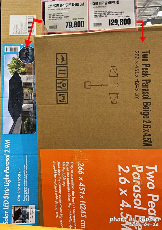 (왼쪽) 스트라이프 솔라라이트 파라솔 3M(SOLAR LED STRIP LIGHT PARASOL). 가격은 79,800원.