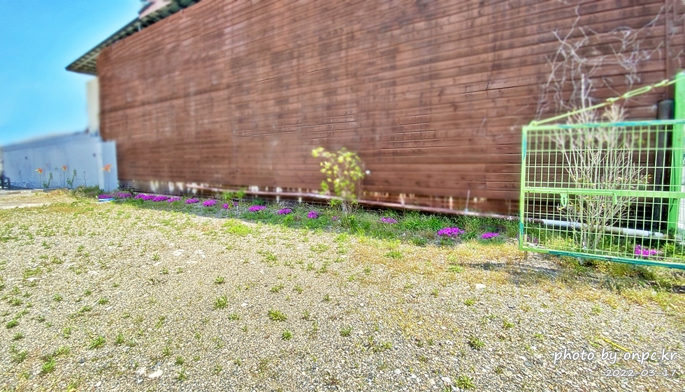 나무 벽 따라 길게 꽃과 나무를 심었어요. 꽃 사이에도 풀이 많네요 ㅎ