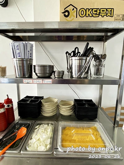 셀프코너에는 고추, 양파, 단무지가 있어요.
