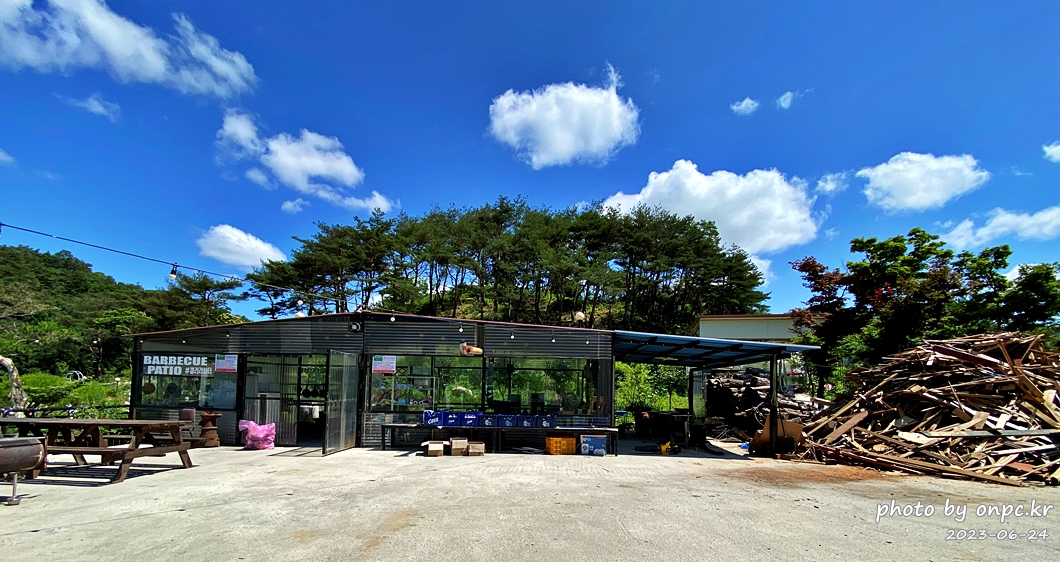 갤러리 쉼터 모텔 무료바베큐장 모습. 땔감용일까요?? 나무가 산더미로 쌓여있어요.